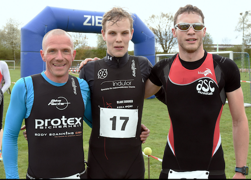 Am vergangen Samstag startete Andreas Thiel vom 3defacto Team ASC Darmstadt beim Viktoria Duathlon in Großenglis, welcher auch gleichzeitig die Hessenmeisterschaft war. Am Morgen regnete es, doch pünktlich …… zum Start zeigte sich das Aprilwetter von seiner besseren Seite. So ging es für ihn bei 10° und trockener Strasse auf die 5 km Laufen, 21 km Radfahren und die 2,5 km Anschlusslauf. Direkt nach dem Start sorgte der spätere Sieger Timo Kuhlmann für ein hohes Tempo, dem Andreas Thiel nicht folgen konnte. Als 5ter ging er auf die Radstrecke. Gleich zu Beginn veranschlagte Thiel bei seiner Paradedisziplin ein hohes Tempo und konnte sich auf den folgenden 21 km auf Position 2 vorarbeiten. Im Anschlusslauf büßte er leider einen Platz ein, sodass am Ende ein 3. Platz im Gesamtklassement zu Buche stand. Dies bedeute gleichzeitig auch den Sieg und den Titel des Hessenmeisters in der Altersklasse M25. Damit zeigte sich Andreas Thiel hochzufrieden: „Damit hätte ich nie gerechnet. Umso mehr freut mich diese tolle Platzierung. Mit meiner Leistung bin ich, bis auf die letzten 2,5 km, sehr zufrieden. Gerade hinten raus muss ich noch besser werden.“