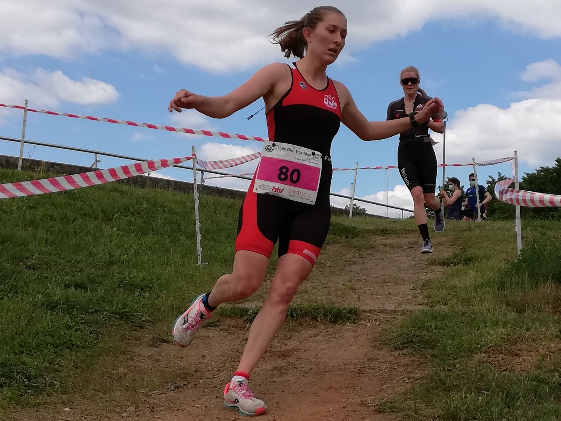 Nach einer Transfer-Pause startete ab 11:00 Uhr auf der Radrennbahn des VC Darmstadt am südlichen Ende Bessungens für den asc die Arbeit, denn die Organisation vor Ort lag in den Händen der Triathlon-Abteilung. Neben der Streckengestaltung und der Koordinierung der einzelnen Startwellen galt es auch das selbstauferlegte Hygienekonzept umzusetzen. Die Sportler*innen starteten maximal zu Neunt auf der Radrennbahn auf ihre 30 Runden, Windschattenfahren war dabei verboten und wurde von Wettkampfrichtern des HTV sorgfältig kontrolliert. Mit Abschluss der Radstrecke galt es innerhalb von fünf Minuten das Rad abzustellen, in die Laufschuhe zu wechseln und die abschließende Disziplin zu beginnen. Die sieben Lauf-Runden zu jeweils ca. 450m mit Crosslauf-Charakter verlangten den Athlet*innen dabei nochmal die letzten Kräfte ab.