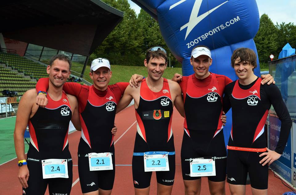 So gingen die Darmstädter wie geplant zu fünft ins Schwimmen. Mit einer gut einstudierten Formation blieben sie ihrer Marschroute treu, wurden aber von der Stärke der Konkurrenz überrascht. Mit 12:12 Minuten über die 750 Meter der Schwimmdistanz belegten Jens Hoffmann, Jens Haase, Robert Kiss, Sascha Christiansen und Moritz Belmann nur den siebten Zwischenrang. Allerdings hatte das Quintett die Podestplätze immer noch im Blick. Immerhin fehlte auf das führende Team aus Bruchköbel nur eine Minute. So ging es beim Jagdstart vor dem Radwechsel Schlag auf Schlag. Alle zehn Mannschaften wurden innerhalb von zwei Minuten auf die 21 Kilometer lange Radstrecke gelassen. Dies verdeutlichte die Leistungsdichte in der dritten Hessenliga. Vor dem letzten Rennen kämpften der TV Bad Orb, Eintracht Frankfurt und der asc Darmstadt um die beiden Aufstiegsplätze. Der Rest der Liga, von Platz vier bis Platz zehn, war im Abstiegskampf gefangen. Diese Dramatik zeigte sich auf der Radstrecke. Das bis dato letztplatzierte Team des MTV Kronberg bestimmte die Geschwindigkeit auf der Radstrecke. Auch die anderen Mannschaften aus dem Keller der Liga gingen hohes Risiko, um den Abstieg zu vermeiden. Den Teams aus Fulda und Bruchköbel wurde dies zum Verhängnis. Mit jeweils einer Minute Zeitstrafe verloren sie an Plätzen. Für die Darmstädter eine willkommene Möglichkeit, an den beiden Mannschaften vorbeizuziehen. Nach einem guten Radrennen, welches durch den starken und böigen Wind bestimmt worden ist und in dem die Heiner den Abstand zu den vorderen Plätzen leicht verkürzen konnten, gingen die verbliebenen vier asc-ler, Jens Haase stieg auf der Radstrecke aus, auf die abschließende fünf Kilometer lange Laufstrecke. Gemeinsam riefen sie eine gute Leistung ab. Mit einer Laufzeit von 19:16 Minuten liefen die Darmstädter am Ende des Teamsprints Hand in Hand über die Ziellinie.